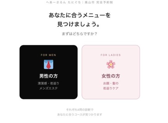 へあーさろん たにぐち は、 ただ髪を切るだけの理容室じゃありません。 薄毛を目立たなくするカット、 育毛促進スパシャンプー、 だんだん肌が若返る美肌シェービング。 他店では体験できない、 清潔感と若返りのメニューが揃っています。 「なんか最近、いい感じだね」と言われたい方へ。 4問の診断で、あなたに合うメニューが見つかります。